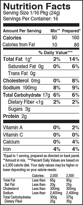 Real cheddar cheese, jalapenos and sun-dried tomatoes make this corn bread a spicy taste treat. Bake in a 8x8 pan or make corn muffins. Add spicy sausage or grilled vegetables to create your own corn bread masterpiece. Net weight 13.3 oz. Servings - 16.