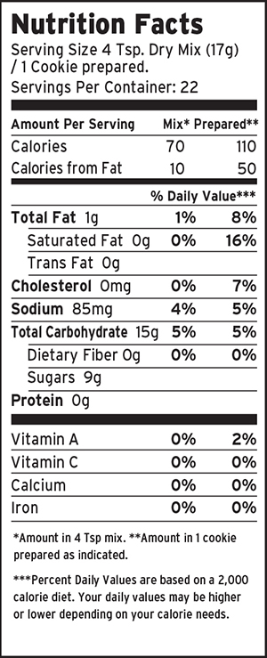 Sugar, specialty flour (rice flour, potato starch, rice starch), chocolate chips (sugar, unsweetened chocolate, cocoa butter, soy lecithin [an emulsifier]), molasses powder, vanilla powder, salt, baking soda, xanthan gum.
