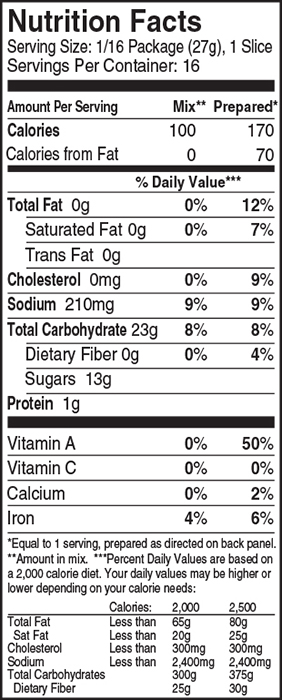 A special blend of spices makes this the most flavorful pumpkin bread you’ll ever eat. Yum! Great for snacks and dessert, or make pumpkin muffins and serve warm for breakfast. Net Weight 15.0 oz. Servings - about 16.